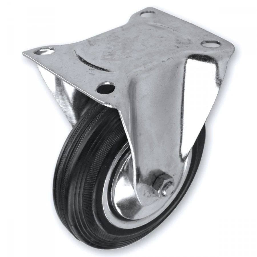 Bockrolle mit einem Durchmesser von 200 mm. Der Reifen ist aus Vollgummi, das Gehäuse indes ist aus gepresstem Stahlblech, das mit einem Fadenschutz das Eindringen von Schmutz und Fäden in das Rollenlager verhindert. Die Bockrolle ist nicht schwenkbar und verleiht Maschinen und Geräte die notwendige Richtungsstabilität. Die Radachse ist zudem verschraubt