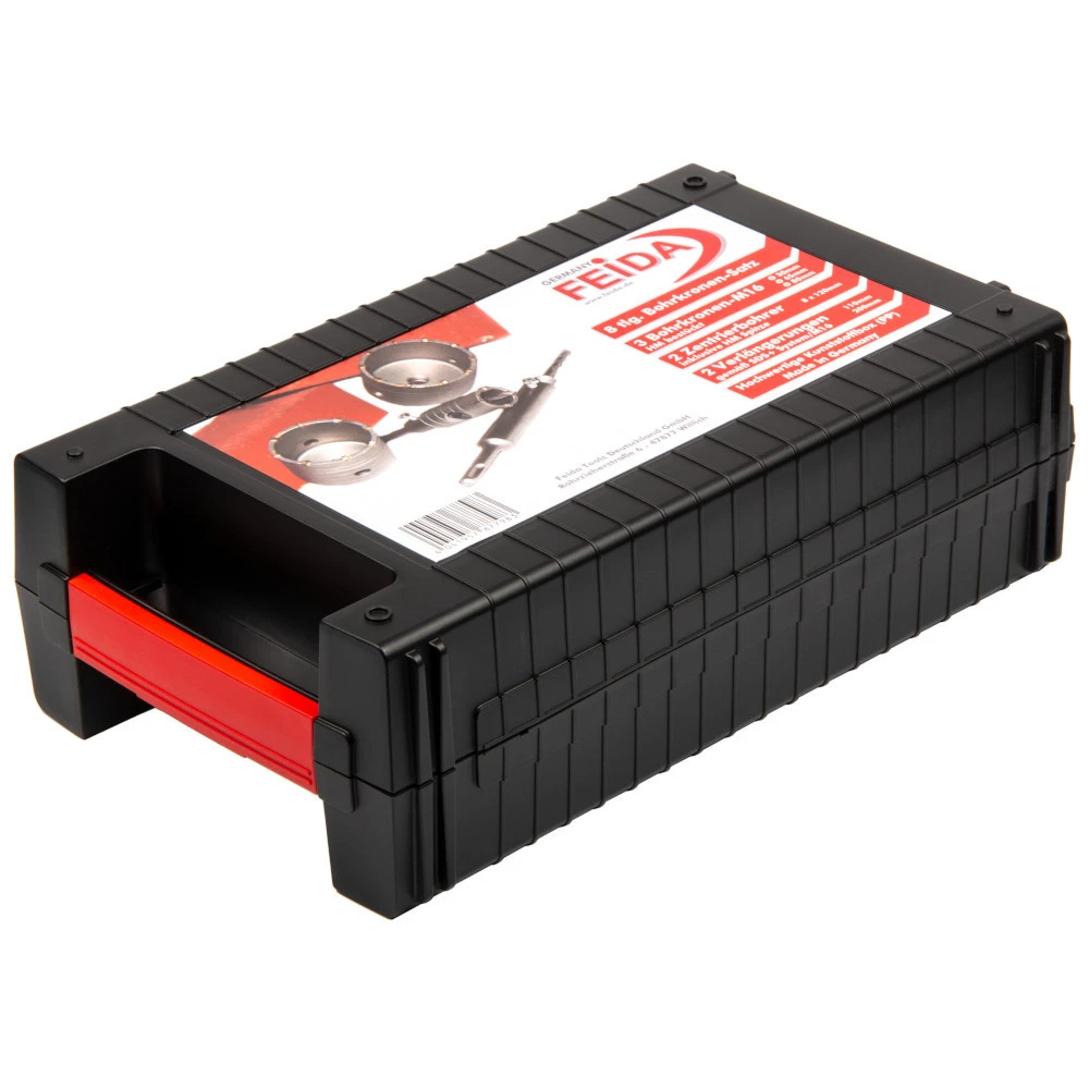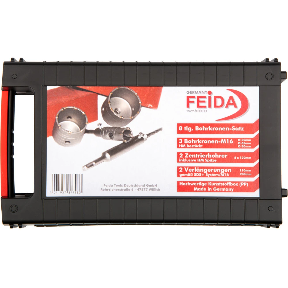 Das 8-teilige Bohrkronen Set von Feida eignet sich unter anderem ideal für Rohrdurchbrüche oder zum Setzen von Unterputzdosen. Geeignet ist die Bohrkrone für Mauerwerk, Beton, Leichtbeton oder Naturstein. Das strapazierfähige Hartmetall bestückte Bohrkrone eignet sich ideal für saubere Bohrungen. Die Bohrkrone besitzt zur besseren Bohrmehlabfuhr am Bohrkronen-Grundkörper am Umfang eine Förderwendel.