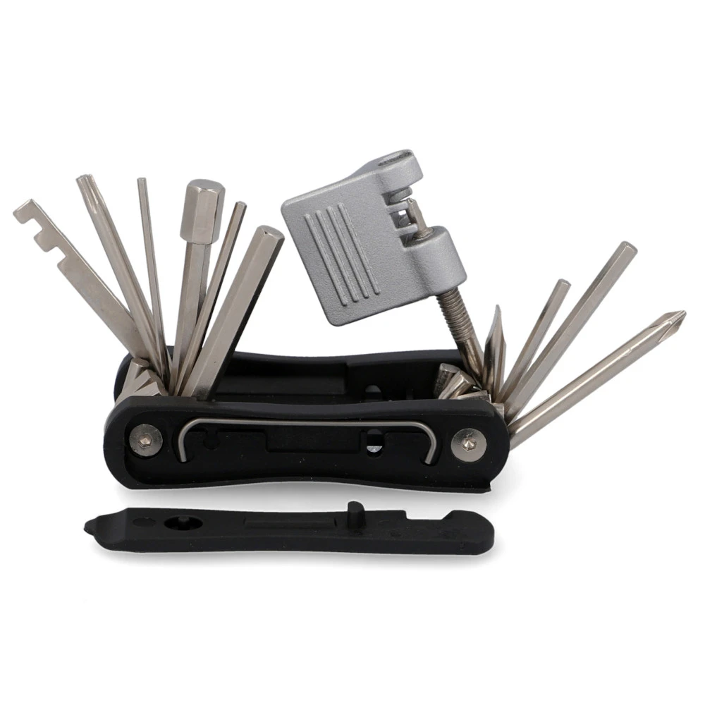 Das 15-teilige Multitool von Fischer ist durch den integrierten T25 speziell auch für E-Bikes geeignet. Mit dem T25 Werkzeug ist es möglich, die M15 Steckachse am Vorderrad eines E-Bikes zu lösen. Selbstverständlich ist das Multifunktionswerkzeug auch für Fahrräder ohne Elektromotor geeignet. Das vielseitige Werkzeug kann die meisten Probleme des Fahrrads als Reisewerkzeugsatz beheben. Auch grundlegende Wartungsarbeiten oder tägliche Haushaltsreparaturen können damit durchgeführt werden. Zusätzlich helfen die beiden Reifenheber einen platten Reifen zu reparieren. Dank dem Kettennietdrücker und Kettenfangdraht können Fahrradketten reparieren werden. Darüber hinaus ist das Multifunktionswerkzeug sowohl mit einem Speichenspanner, Schlitz- und Kreuzschraubendreher als auch Innensechskantschlüssel in verschiedenen Größen ausgestattet.