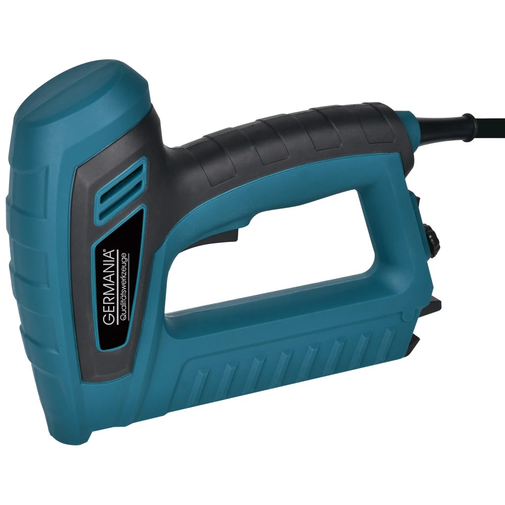 GERMANIA Elektrotacker zur Fixierung von Holzlatten, Drahtgewebe, Folien, Pappe, Dichtungsprofilen, Dekor- und Polstermaterialien auf Holz und anderen Materialien. Einstellbare, stufenlose Schlagkraftregulierung für werkstoffsparendes Arbeiten. Mit Auslösesicherung, die Freigabe erfolgt nur bei Materialkontakt.