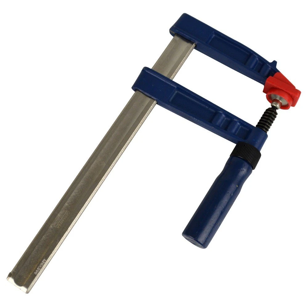 Profi Schraubzwinge von GERMANIA, in vier Spanbereichen von 300 x 120 mm. Die Schraubzwinge hat eine geriffelte, verzinkte Profilschiene, Kunststoff-Schutzbacken und einen hölzernen Griff, blau lackiert.
