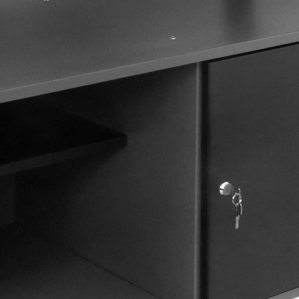 Eintürige Werkbank aus Metall mit massiver Arbeitsplatte aus Holz. Die großzügige Arbeitsplatte ermöglicht die ordnungsgemäße und bequeme Organisation deiner Arbeit. Unterhalb der Arbeitsplatte befindet sich eine einzelne Schublade, ein offener Schrank mit Regal und ein verschließbarer Schrank mit einem Regalboden im Inneren. Das Tischgestell ist aus pulverbeschichtetem Metall, korrosions- und kratzfest.