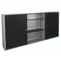 Doppeltüriger Werkzeug-Wandschrank aus Metall für alle, die ihre Werkzeuge in einer guten Ordnung halten wollen. Der Wandschrank ist geräumig und leicht an der Wand zu montieren. Der Werkzeugschrank besteht aus 3 Elementen – zwei verschließbare Teile und ein offenes Mittelteil mit Lochwand. Das Mittelteil ist mit zwei Metall-Regalböden ausgestattet, die in der Höhe variabel montierbar sind.