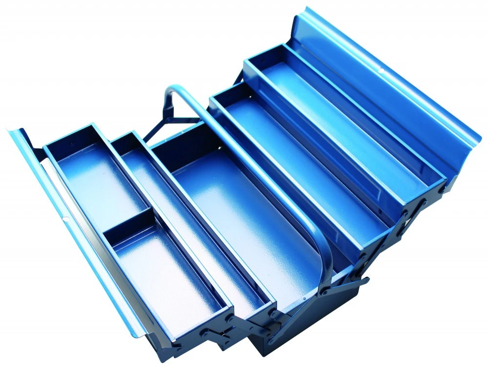 Stabiler Werkzeugkoffer aus hammerschlaglackiertem Stahlblech, mit 5 Fächern auf drei Ebenen. Der Werkzeugkoffer bietet viel Platz für Kleinteile oder kleinere Elektrowerkzeuge. Hohe Standfestigkeit auch bei voll geöffneten Auszügen. Ein extra stabiler Griff sorgt für die nötige Sicherheit beim Transportieren.