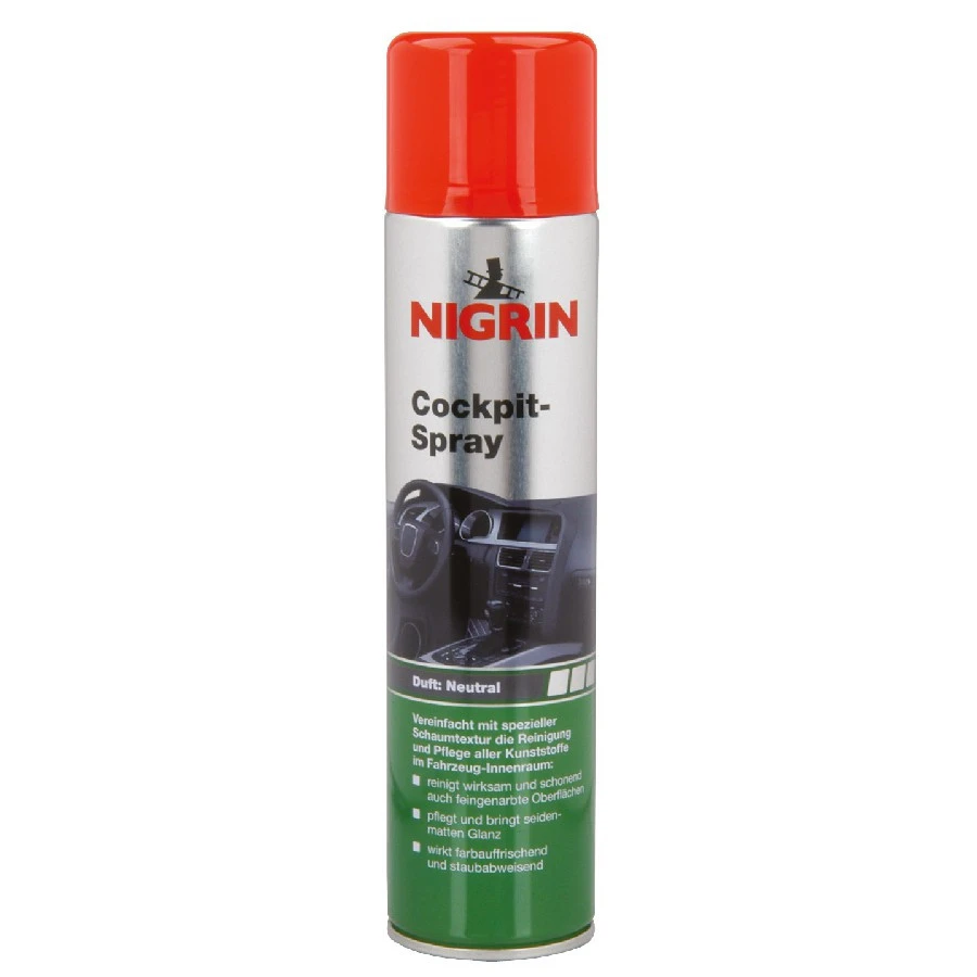 Nigrin Cockpit-Spray erleichtert mit seiner speziellen Schaumtextur die wirksame und schonende Reinigung und Pflege aller Kunststoffe im Fahrzeug-Innenraum. Der Schaum ermöglicht eine einfache, gezielte Anwendung. Nigrin Cockpitspray bildet einen wasserfesten, seidenmatten, schmutzabweisenden und antistatischen Schutzfilm auf dem Kunststoff und vermindert so den Pflegeaufwand.