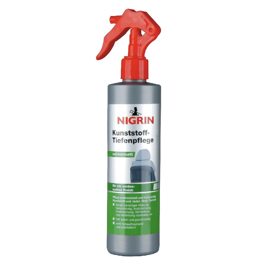 Nigrin Kunststoff-Tiefenpflege ist die professionelle Pfelge für Kunststoffoberflächen innen und außen, Vinyl, Gummi und Kunstleder. Sie ist auch für die Pflege und Erhaltung von Luftkanälen und Kühlschläuchen im Motorraum sowie für alle Gummidichtungen, z.B. an Türen, Schiebedach, Kofferraum usw. geeignet. Nigrin Kunststoff-Tiefenpflege sorgt nachhaltig für den Werterhalt des Autos, denn es schützt alle Kunststoffe vor vorzeitiger Alterung, z.B. durch Versprödung, Austrocknung, Rissbildung und Ausbleichung. Die Kunststoffpflege bildet einen langanhaltenden, antistatischen, wasser- und schmutzabweisenden Schutzfilm und vermindert so den Pflegeaufwand.