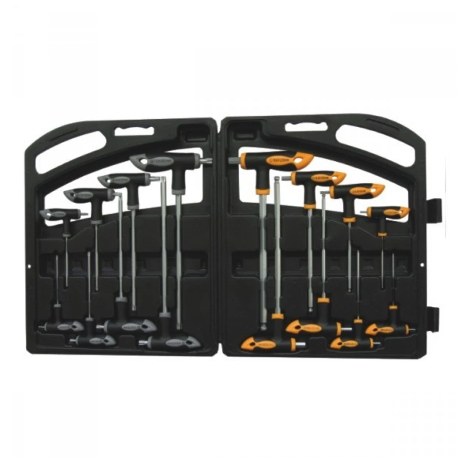 Der Winkelschlüssel-Satz, mit 16 verschiedenen Größen, ist in T-Profil Sechsrund und IX Innensechskant unterteilt.