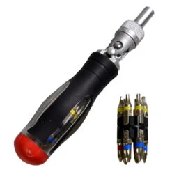 Praktischer Ratschenschraubendreher von GERMANIA mit um 180° verstellbarem Kopf und 12 verschiedenen Biteinsätzen im Griff. Der ergonomisch geformte 2-Komponenten Handgriff bietet die Sichtmöglichkeit auf den innenliegenden Bithalter aus Kunststoff. Der Ratschenkopf lässt sich in 5 Positionen arretieren. Die Knarrenfunktion mit rechts/links Umstellung lässt sich in der Mittelstellung arretieren. Das Farbleitsystem erleichtert die schnelle Bitauswahl.