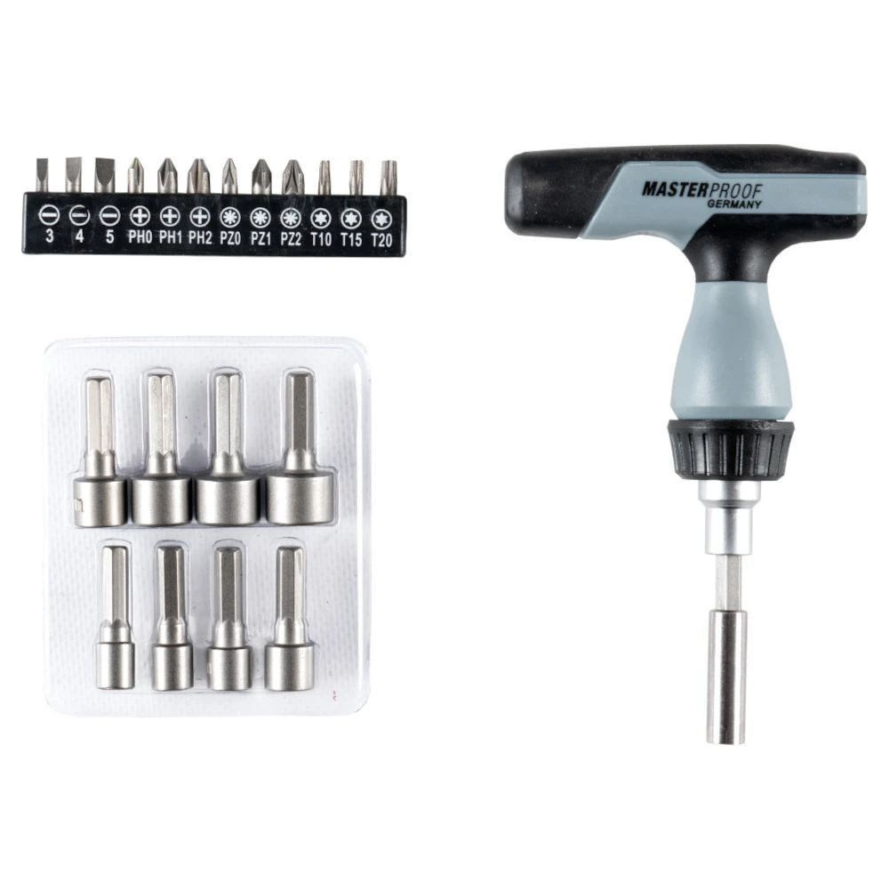 Der Ratschenschraubendrehersatz mit verschiedenen Bit- und Steckschlüsseleinsätzen ist ideal für Montage- und Reparaturarbeiten einsetzbar. Der praktische Schraubendreher mit T-Griff für optimale Kraftübertragung ist besonders geeignet, um auch festsitzende Muttern und Schrauben zu lösen.