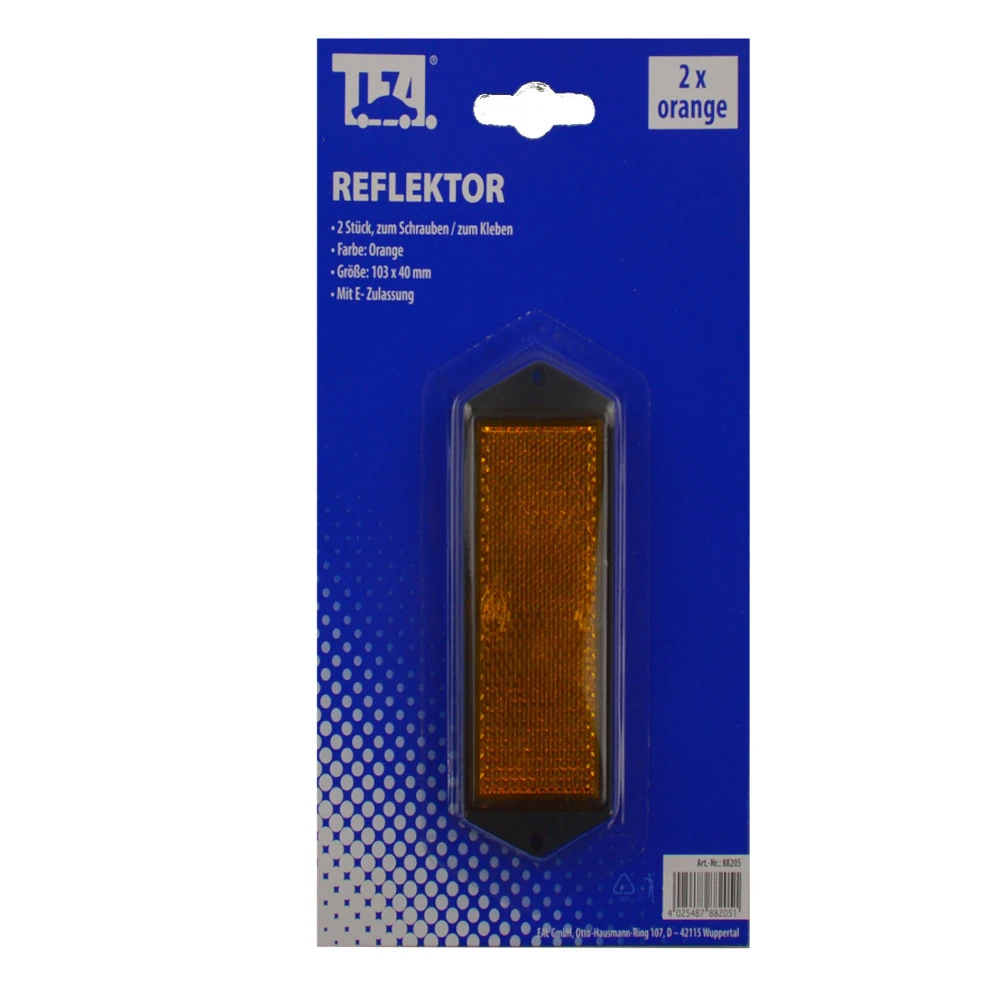 Die beiden Reflektoren erhöhen die Sichtbarkeit von Anhängern, Caravan oder Fahrrädern. Mit ihren Maßen von 103 x 40 mm und Schraublöchern von ca. 4 mm sind sie sowohl für die Schraub- als auch für die Klebebefestigung konzipiert und lassen sich einfach und schnell montieren.