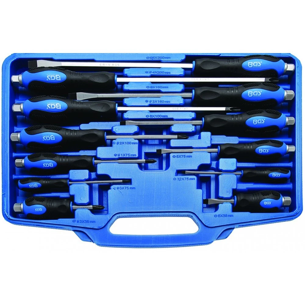 BGS Schraubendreher-Satz 12-teilig aus Chrom-Vanadium-Stahl. Im Set enthalten sind 6 Schlitz-Schraubendreher und 6 PH Kreuzschlitz-Schraubendreher in unterschiedlichen Größen. Die Längenangabe ist jeweils ohne Griff und 6-kant.